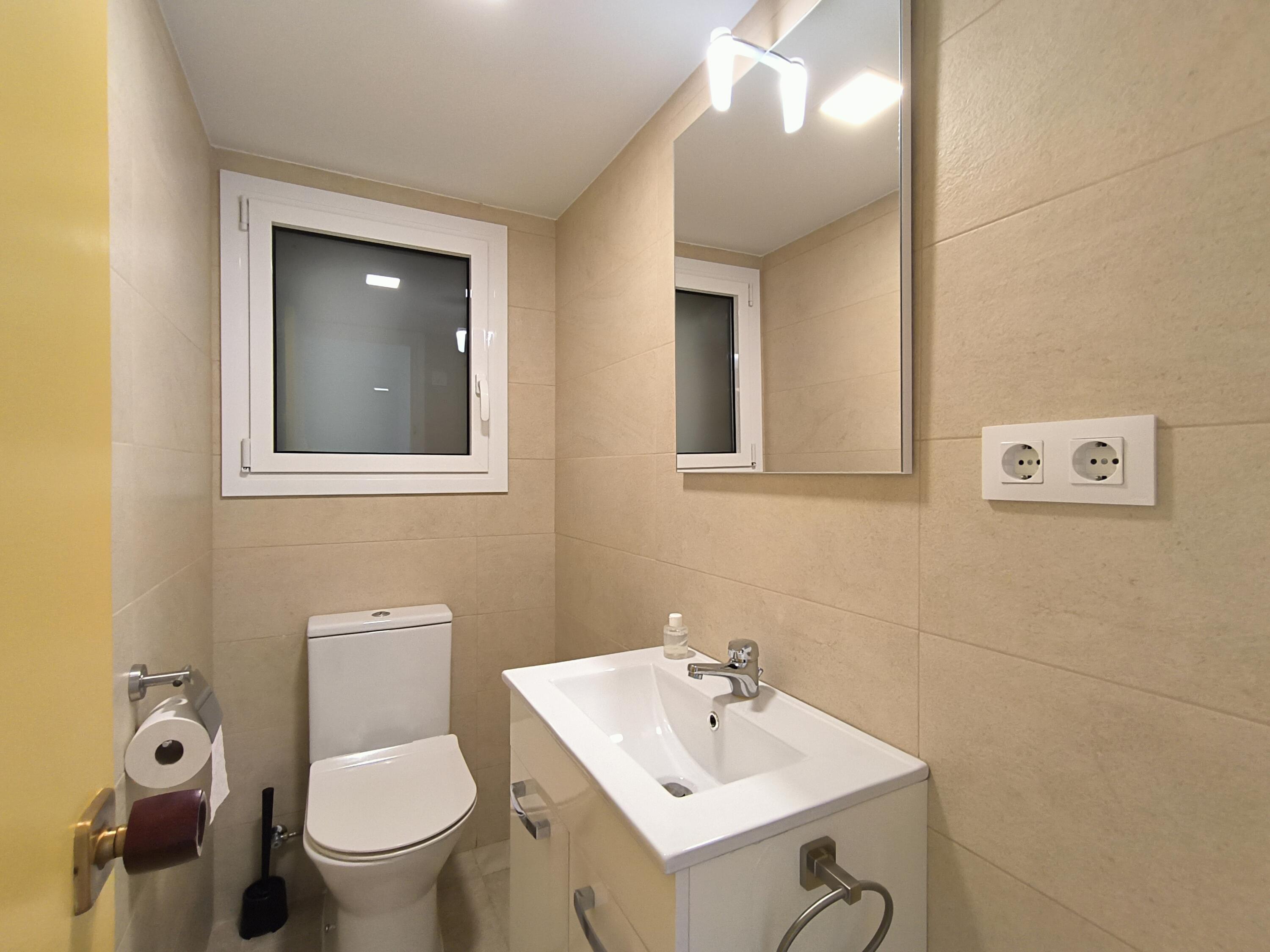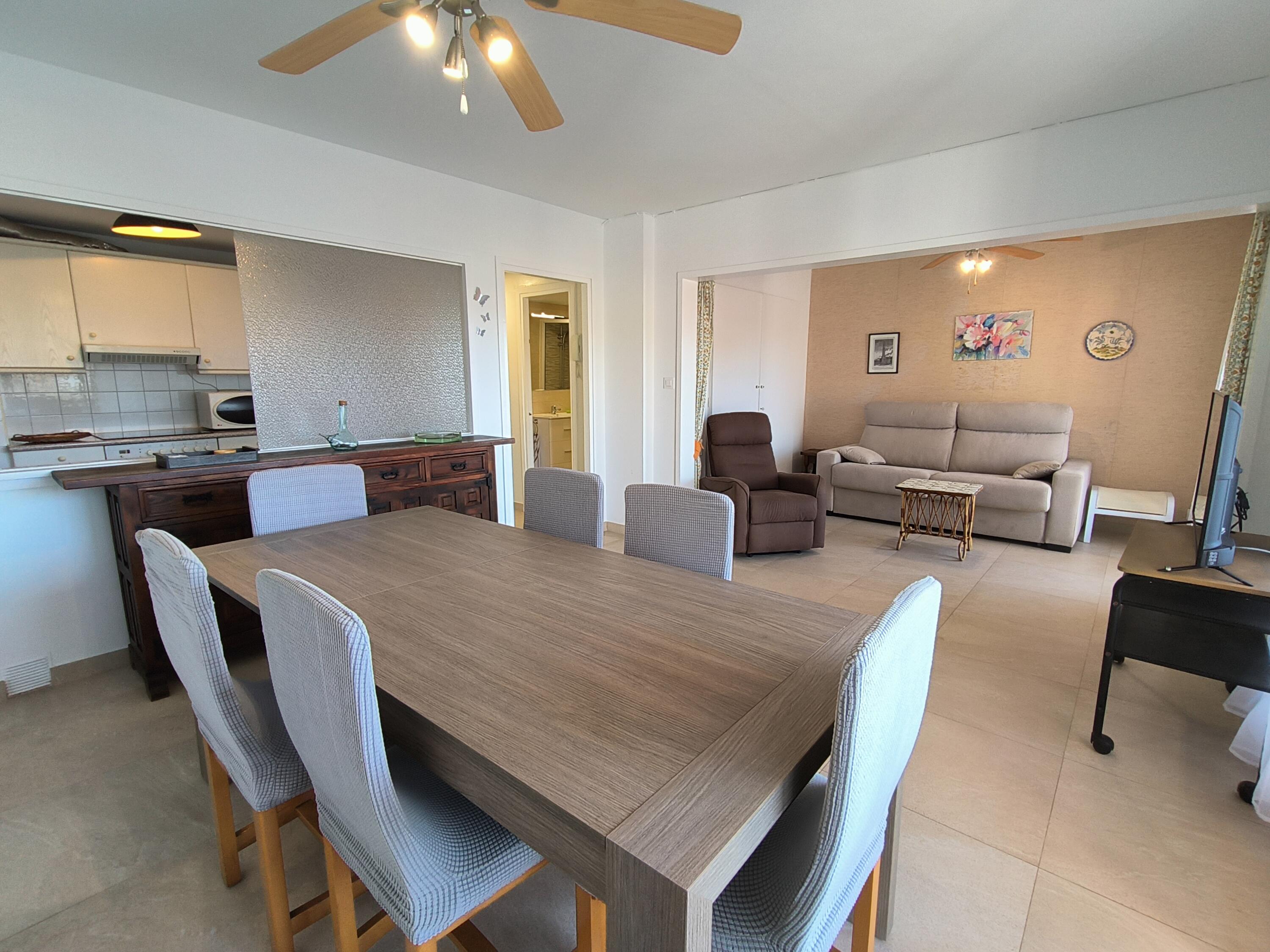 SEASONAL rental apartment in the COMTE D’URGELL building, located 10 m from the beach, next to the Torre Valentina bridge, which connects the seafront promenades of Sant Antoni and Torre Valentina. This bright apartment is on the 3rd floor and offers lovely side sea views, facing Torre Valentina. The apartment has two bedrooms: one spacious bedroom with a double bed and another with three single beds. The living-dining room is spacious and comfortable. The kitchen is fully equipped and semi-open to the dining area, with a serving hatch. The apartment also features a large terrace equipped with outdoor furniture and a sun awning, ideal for enjoying sunny moments and ensuring privacy. It also includes a full bathroom with a shower tray and a guest toilet, both recently renovated. In addition, the apartment has a laundry room located opposite the apartment, which can also be used as a small storage room for suitcases or beach equipment.